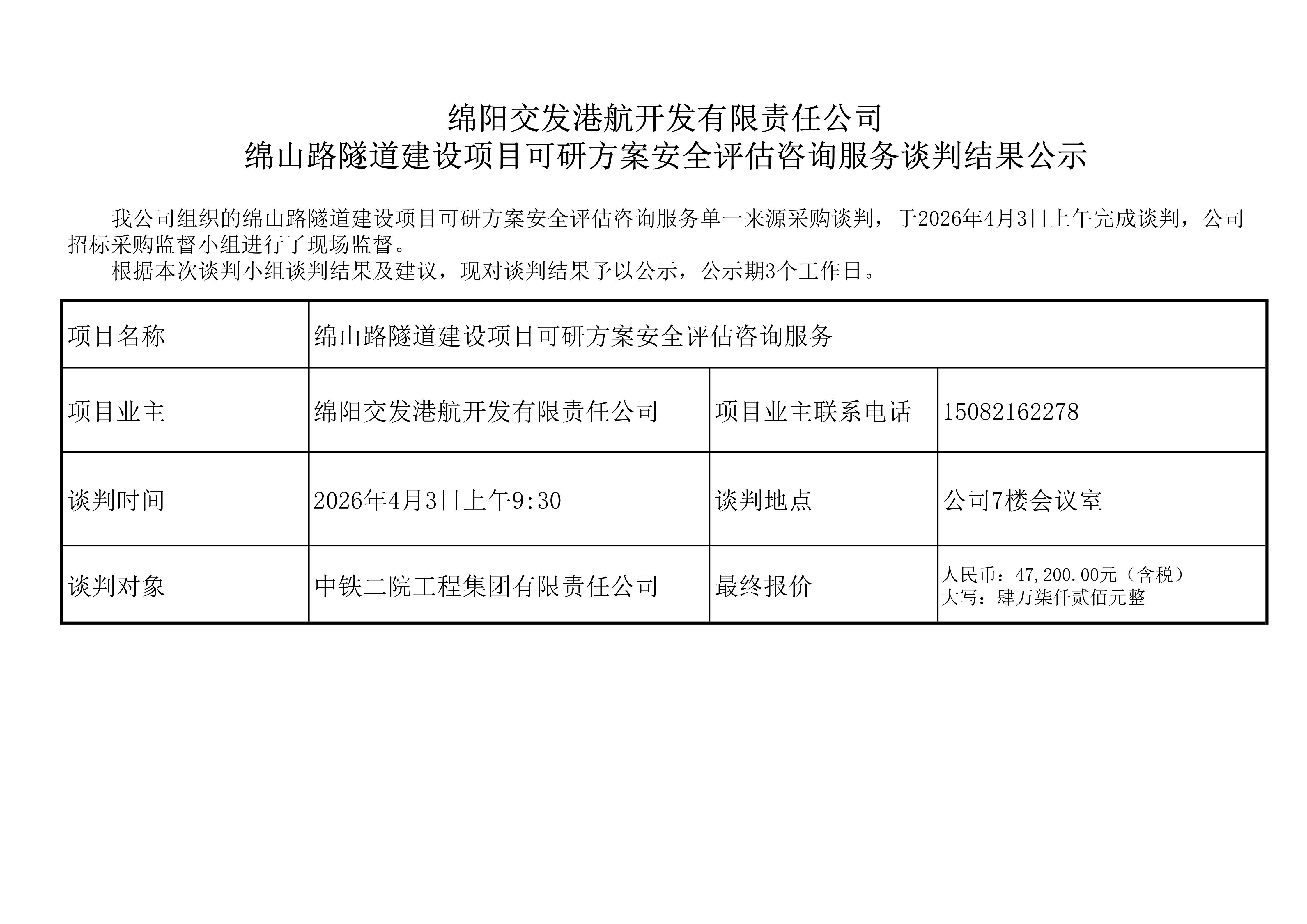 绵阳交发港航开发有限责任公司 绵山路隧道建设项目可研方案安全评估咨询服务谈判结果公示